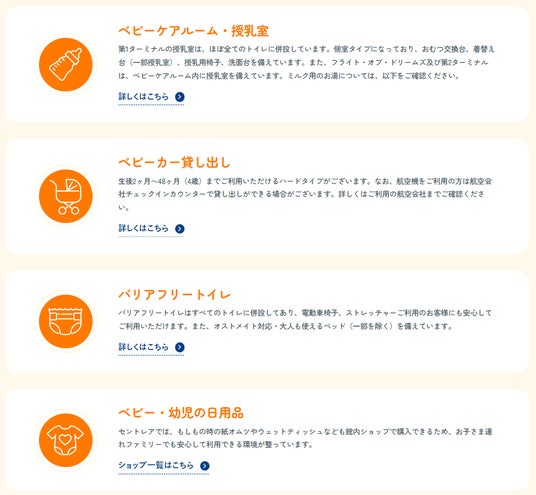 また、同ページ内で各店舗へのベビーカーの持ち込み可否やお子様向け食器の貸し出しの有無などをまとめたリストや空港内のベビーケアルーム・授乳室、バリアフリートイレなどの設備・サービス情報も掲載しており、親御さんも一目で必要な情報がわかる内容となっています。