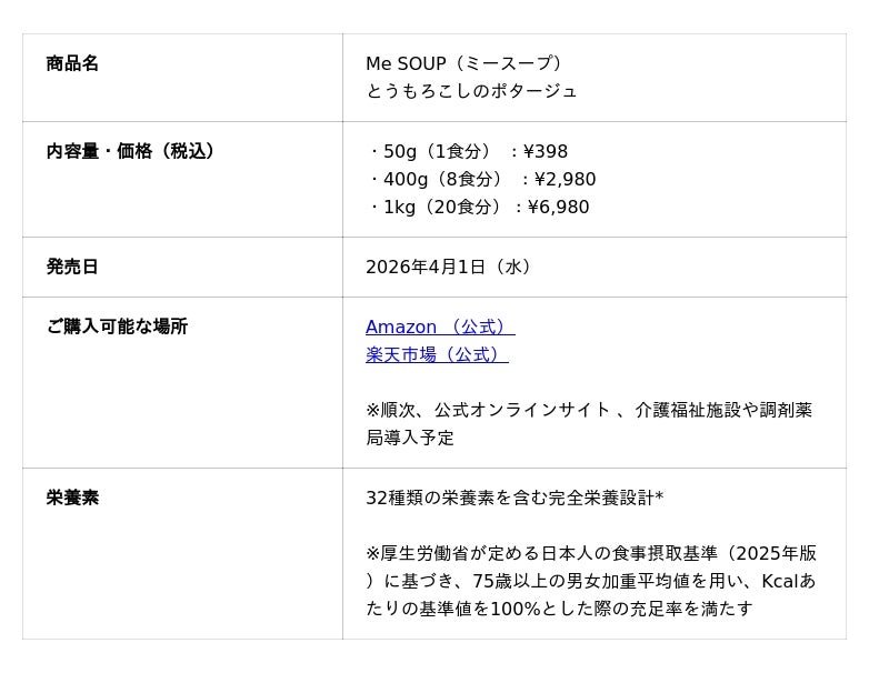 シニア向け完全栄養食ブランド「Me TIME FOODS」を展開する株式会社LacuS(本社:新潟県新潟市、代表取締役:古津瑛陸、以下ラコス)は、2026年4月1日より、同ブランドの新商品となる完全栄養スープ「Me SOUP【とうもろこしのポタージュ】(ミースープ)」の販売を開始いたします。