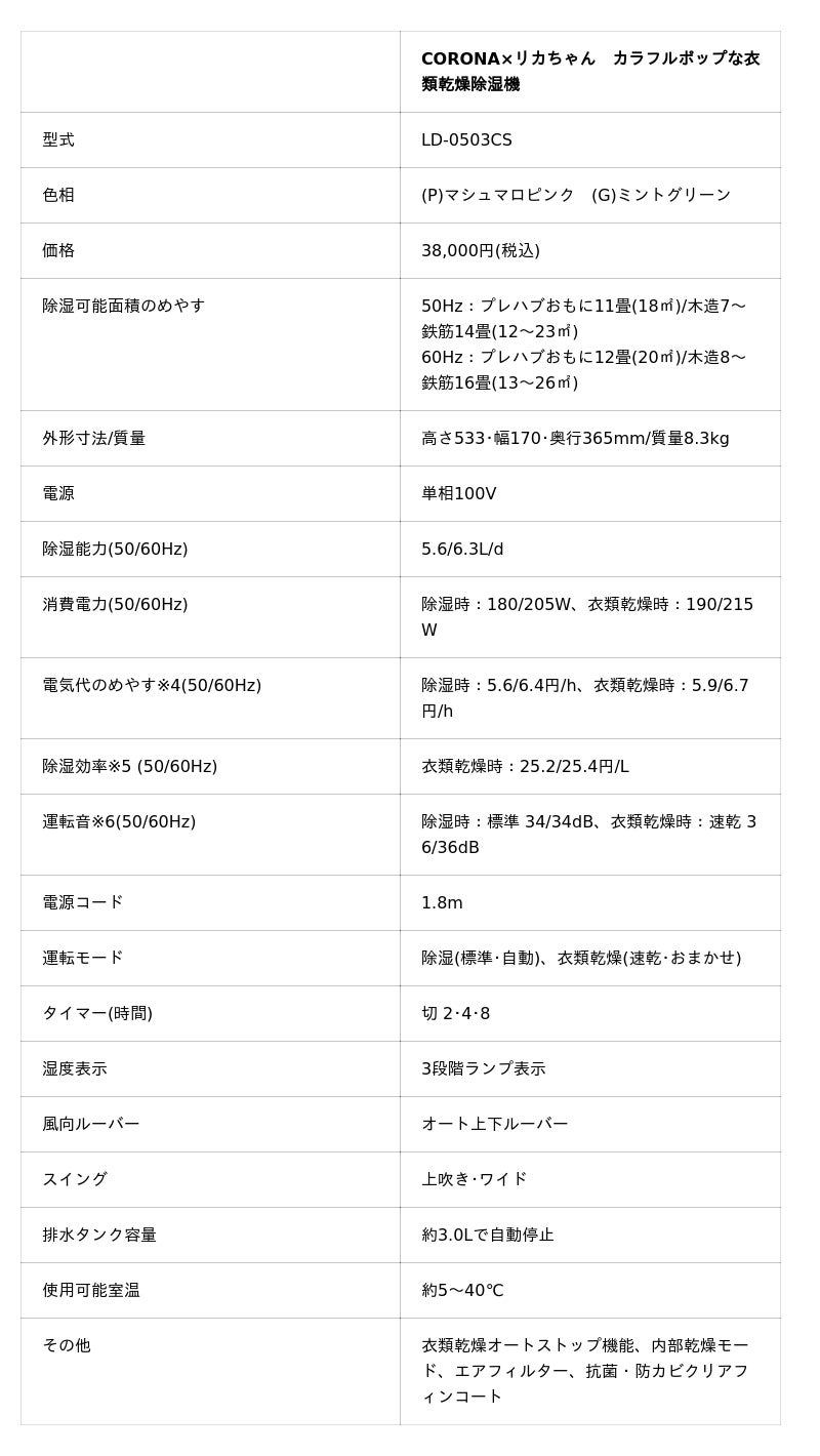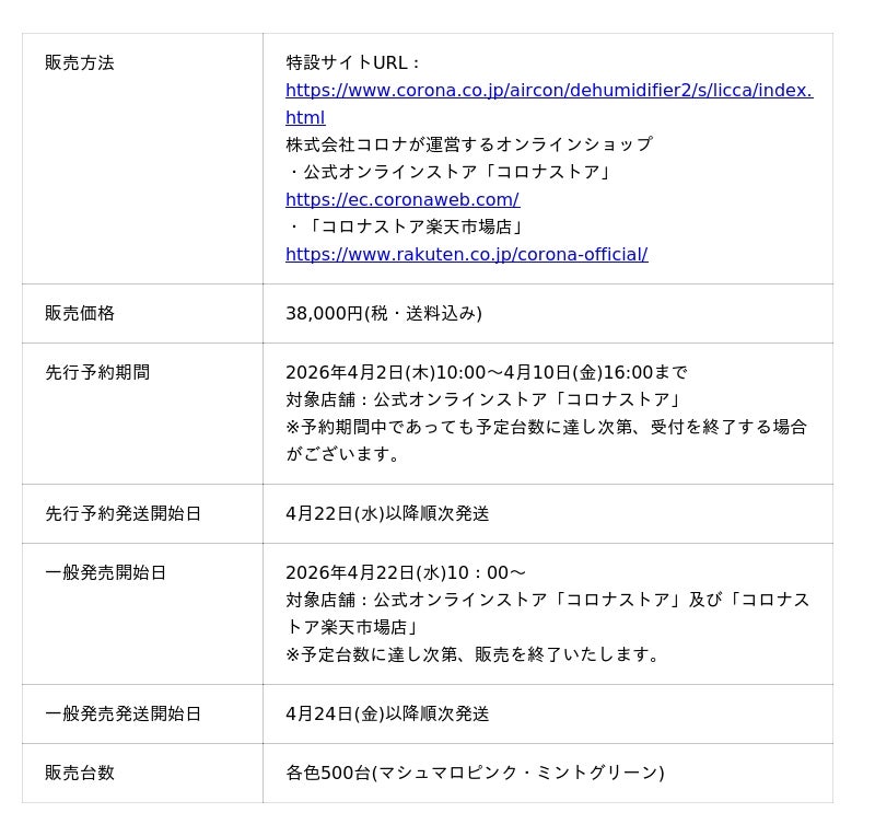 株式会社コロナ(本社:新潟県三条市、社長 大桃満、以下「コロナ」)は、幅広い世代から愛され続ける「リカちゃん」(発売元:株式会社タカラトミー)とコラボした、ポップなカラーがかわいい特別デザインの「CORONA×リカちゃん カラフルポップな衣類乾燥除湿機」を発売いたします。当社公式オンラインストア「コロナストア」で4月2日(木)10時より先行予約を開始します。一般販売は、公式オンラインストア「コロナストア」及び「コロナストア楽天市場店」で4月22日(水)より開始します。販売台数は、「マシュマロピンク」と「ミントグリーン」の各色500台限定で、価格は税込38,000円です。