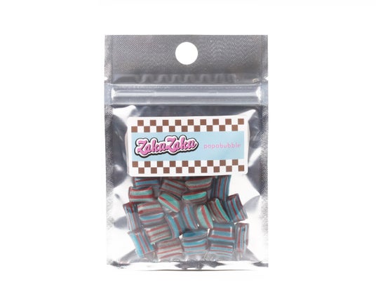 ミントブルーとチョコレートカラーを基調に、爽やかさと遊び心を感じるデザインに仕上げています。持ち手にはキャンディの縞模様をイメージしたストライプをあしらい、アクセントを加えました。