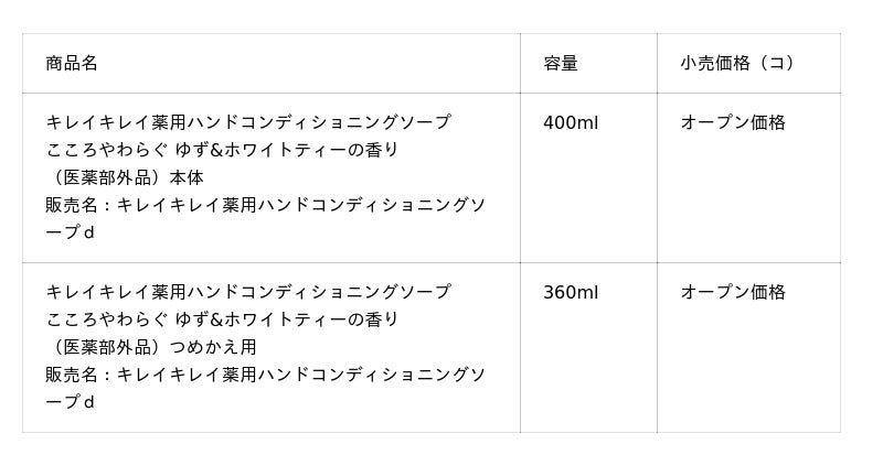 ・『キレイキレイ薬用ハンドコンディショニングソープこころやわらぐ ゆず&ホワイトティーの香り』を新発売