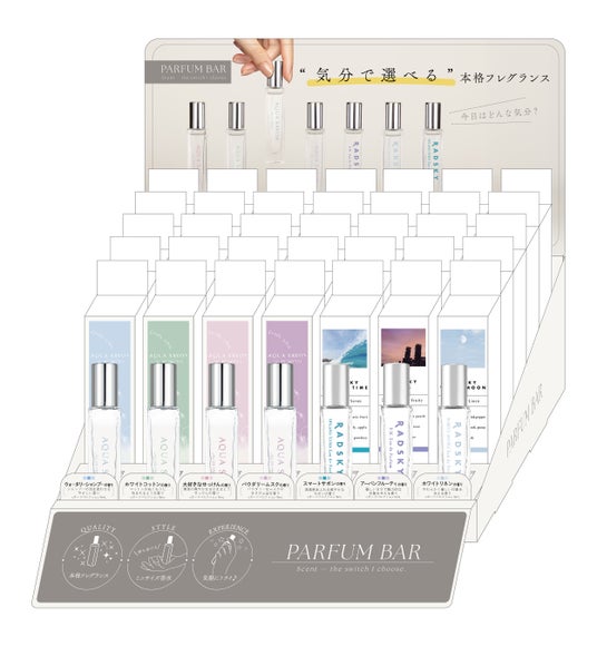 「PARFUM BAR」は、アクア シャボンやエンジェルハート、ラッドスカイなどの複数のフレグランスブランドを横断して展開する、ミニサイズのフレグランスシリーズです。