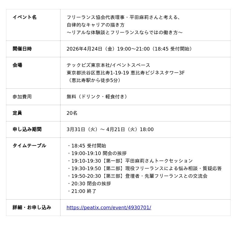 「フリーランスのリアルな体験談や働き方」をテーマにしたトークイベント・交流会を4月24日(金)19時より、テックビズ東京本社(恵比寿)・イベントスペースにて開催いたします。登壇者には、一般社団法人フリーランス協会代表理事としてフリーランスの社会的立場向上に長年取り組んできた平田麻莉さんをお招きします。フリーランスという働き方のリアルを軸に、その魅力やご自身の体験談についてお話しいただきます。また、平田さんに女性フリーランスからの質問に答えていただく公開お悩み相談の時間や、参加者同士が横のつながりを築ける交流の場も設けます。