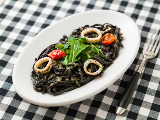 「タリオリーニ」とは、イタリア北部発祥の細長い平打ちパスタのこと。麺、ソース、トッピングの全てにおいて濃厚なイカの旨みを存分に堪能できる商品に仕上げました。麺には、見た目もインパクトのあるイカスミを練りこんだ生パスタを使用。ソースはイカエキスやアンチョビをベースに、味に深みを出すためにナンプラーも使用。本場イタリアでは魚醤「コラトゥーラ」が多く用いられることから、近しい味わいではありつつ日本のお客様にも馴染みのある調味料としてナンプラーを用いるという料理人ならではの一工夫が光ります。また、トッピングのイカは茹でた後に調味液に漬けてマリネしているため、トッピング単体でもイカの風味を最大限にお楽しみいただけます。