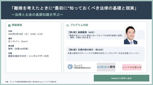 誰もが手軽に司法サービスを利用できることを目指し、スマホ調停を展開する株式会社wakai(URL:https://ddrwakai.co.jp/ 東京都港区:代表取締役社長/的場 令紋)は、ブレイブ少額短期保険株式会社(URL: https://brave-ss.co.jp/東京都中央区:代表取締役社長/ /弁護士 多田 猛)、ひとり親支援団体「シンママ応援の会」(以下シンママ応援/URL: https://clarus.life/member)と共同で、無料オンラインセミナー「離婚を考えたときに“最初に知っておきたい”法律とお金の話(サブタイトル: 離婚で後悔しない選択のための基礎知識セミナー)を開催いたします。