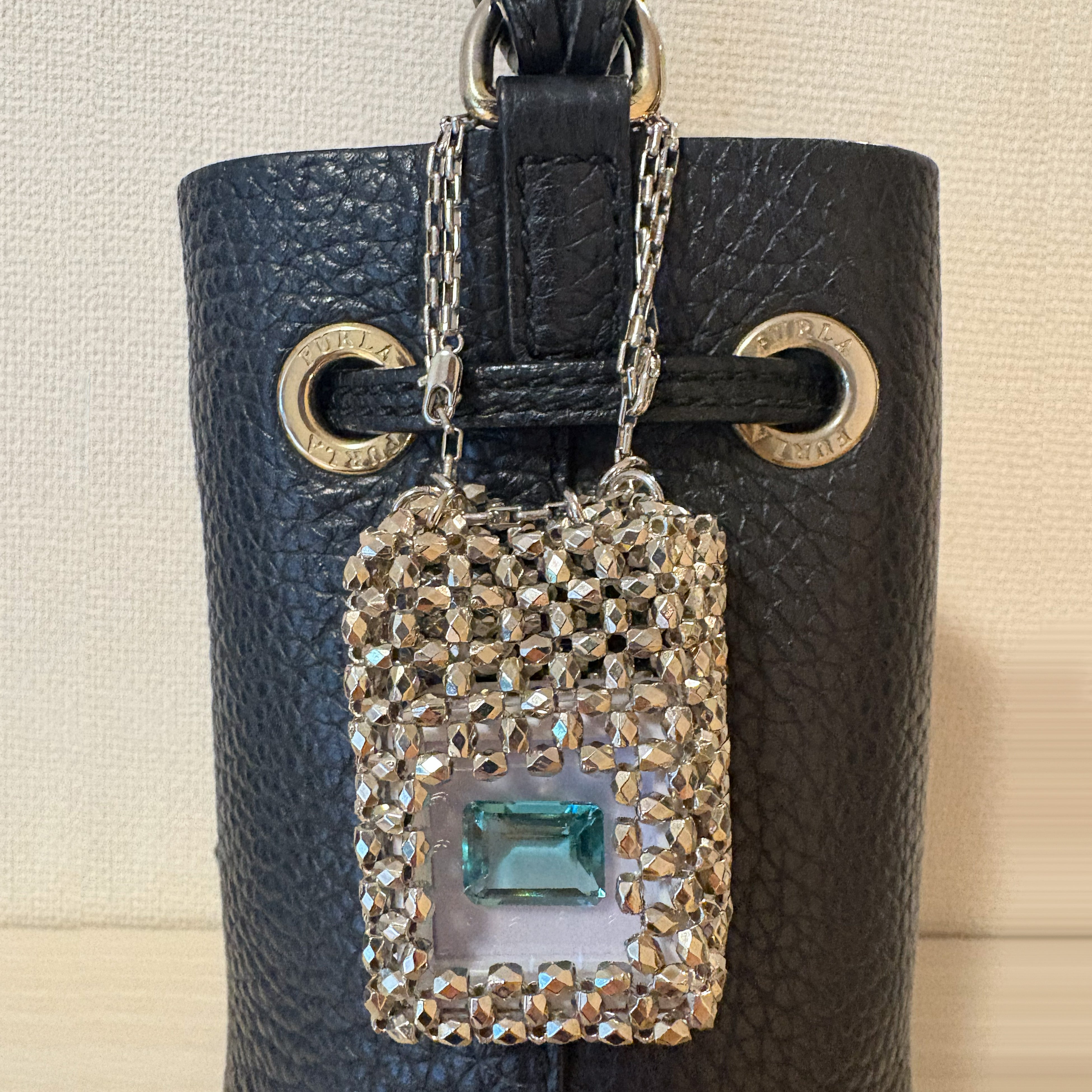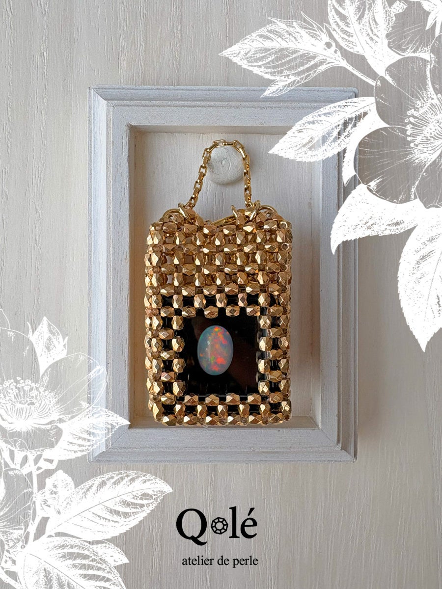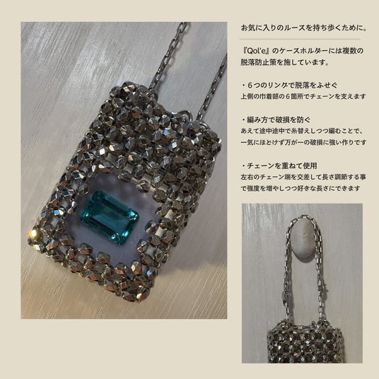 Qol'eの「ルースケースホルダー」は、宝石ルースを入れたケースをメタルビーズで編んだホルダーに収め、バッグに飾って持ち歩けるアクセサリーです。