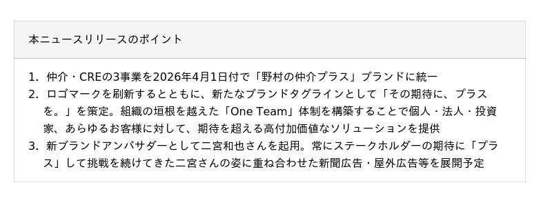 野村不動産ソリューションズ株式会社(東京都港区/代表取締役社長:日比野勇志/以下「当社」)は、 2026年4月1日付で、仲介・CRE※1の3事業(流通事業本部・パートナー営業本部・法人営業本部)を「野村の仲介プラス」ブランドとして統一し、ブランドタグライン※2として「その期待に、プラスを。」を策定しました。ブランドアンバサダーとして二宮和也さんを起用し、新たな「野村の仲介プラス」のメッセージを発信してまいります。
