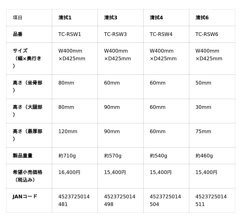 従来品「タカノクッションR」の6タイプから4タイプにすることで、さらに選びやすくなりました。