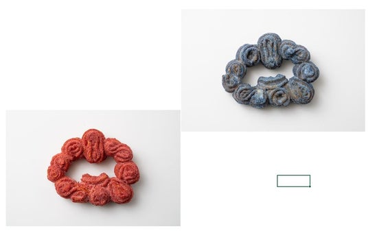 【初登場】<EARTH SWEETS Takeshita Seika >ミャクミャクっぽい?チュロス (苺・ブルーシュガー)各1個 1,296円 (C)Expo 2025