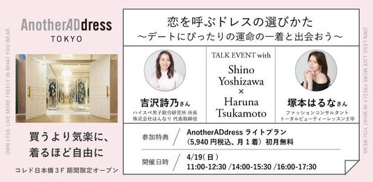2026年4月19日(日)、コレド日本橋内のAnotherADdress TOKYO店舗にて、日本最大級の恋愛婚活スクール「総研アカデミー」を運営するハイスペ男子総合研究所(運営:株式会社はんなり、本社:東京都品川区、代表:吉沢詩乃)の所長・吉沢詩乃と、スタイリスト・塚本はるな氏が登壇するスペシャルイベント「恋を呼ぶドレスの選びかた ~デートにぴったりの運命の一着と出会おう~」が開催されます。