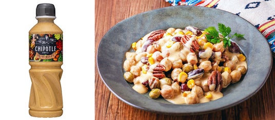 (左)世界を旅するドレッシング チポトレ~スモーキーホットチリ~/(右)メニュー:豆と焼きコーンのチポトレ和え