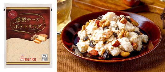 (左)燻製チーズポテトサラダ/(右)メニュー:ナッツとレーズンの燻製チーズポテトサラダ