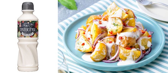 (左)世界を旅するドレッシング シルタースタイル(R)~シルキーオニオン~/(右)メニュー:揚げポテトのシルタースタイル(R)和え