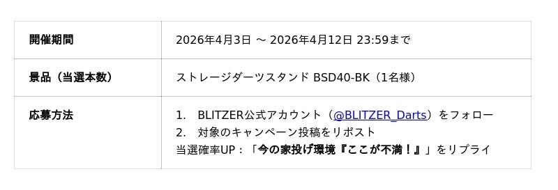 弊社ダーツボード・ゲームブランド「BLITZER(R)(ブリッツァー)」は、本日2026年4月3日(金)~同月12日(日)の10日間に渡り、公式X(旧Twitter)にて、春の新生活を応援するフォロー&リポストキャンペーンを開催いたします 。