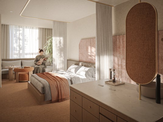 客室は「休むこと」を最優先に設計。産後の身体に負担をかけにくいシーリー製マットレスのベッド、授乳や抱っこがしやすいレイアウト、産後の乱れがちな体内時計を優しく整える照明設計など、細部にまで配慮されています。