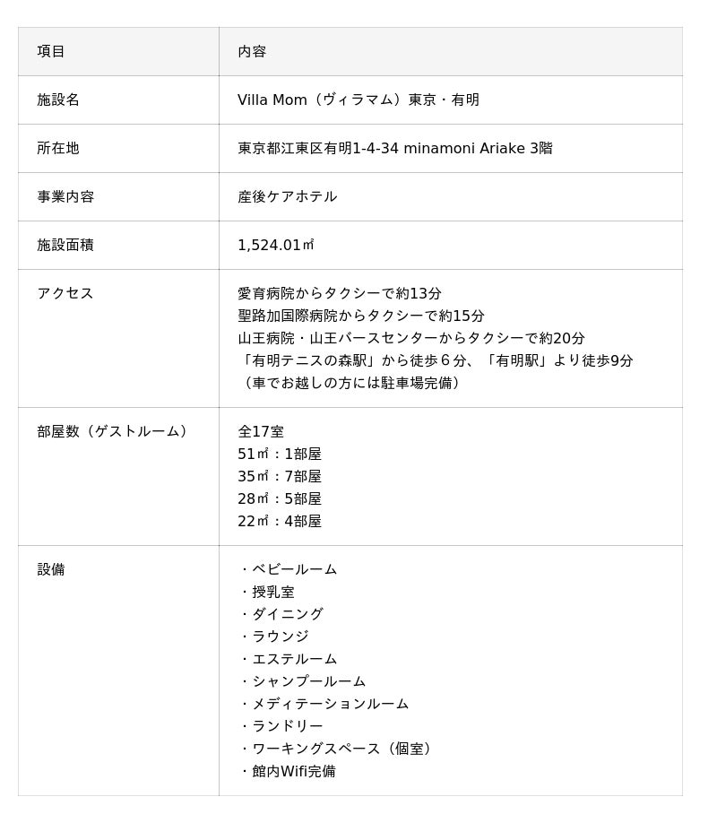 2026年4月3日時点の公開情報調査において、東京都内の主な民間産後ケアホテル/ホテルステイ型産後ケア施設の運営主体を確認した結果、認可保育園・プレスクール等を継続運営する保育事業者が手がける事例はVilla Mom以前には確認されず、Villa Momは“東京都内初の保育事業者運営の産後ケアホテル”と位置づけられます。