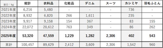 こうした取り組みにより、2025年度の回収量は、前年同期比+142%となる約53,000kgに達し、累計では約100,000kgを回収しています。回収したアイテムは、パートナー企業のリサイクルシステムを活用し、新しく生まれ変わった魅力ある商品としてお客様にご提案しています。