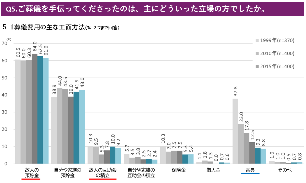 5. 預貯金や互助会など「故人による費用工面」は依然高い水準。香典はさらに低下。