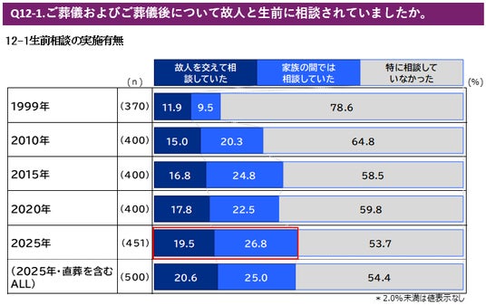 「葬儀に関して生前に相談していたか」という設問について、「生前相談をしていた」と回答した人がコロナ禍の影響垣間見られた2020年調査に比べ6ポイント増加し46.3%になりました。そのうち「故人を交えて相談していた」割合は19.5%となり、1999年の調査から増加し続けています。「終活」という言葉が浸透する中で、故人も含めた家族で相談することが定着しつつあり、生前準備の一般化や自身の死について家族と話し合うことへの抵抗感が下がってきていると考えられます。(12-1)