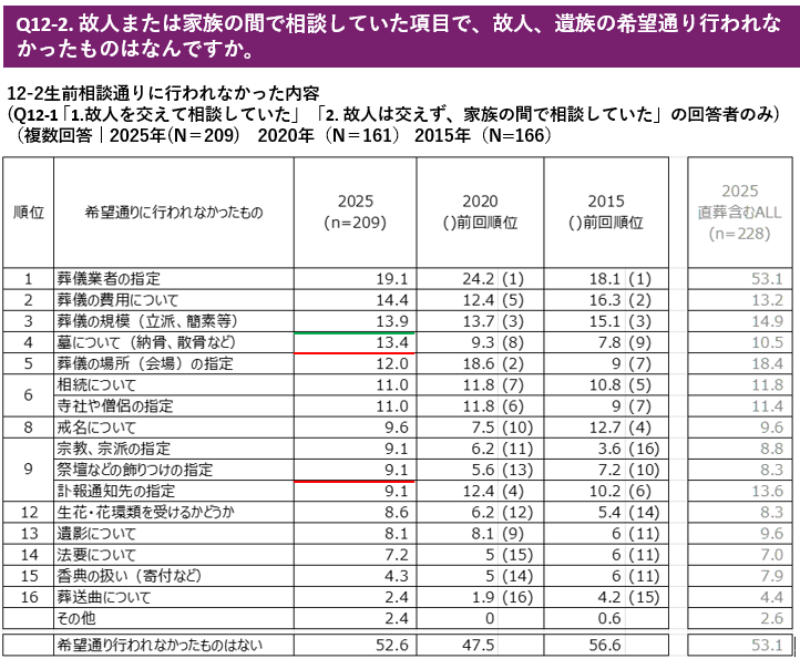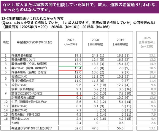 前回調査時はコロナ流行期にあったため、生前話し合いによる希望がかなわないケースが47.5%と低下していましたが、今回はコロナ以前まではいかないものの大きく戻ってきています。前問の生前相談が少しづつ浸透しつつある傾向とみられる一方で、少子高齢化や核家族化など現代的な課題もあり、参列数や費用、埋葬の在り方などが実現されにくい傾向も見受けられます。(12-2)