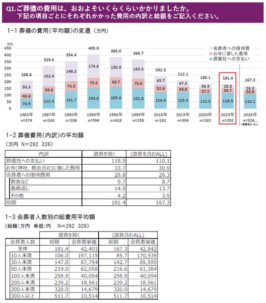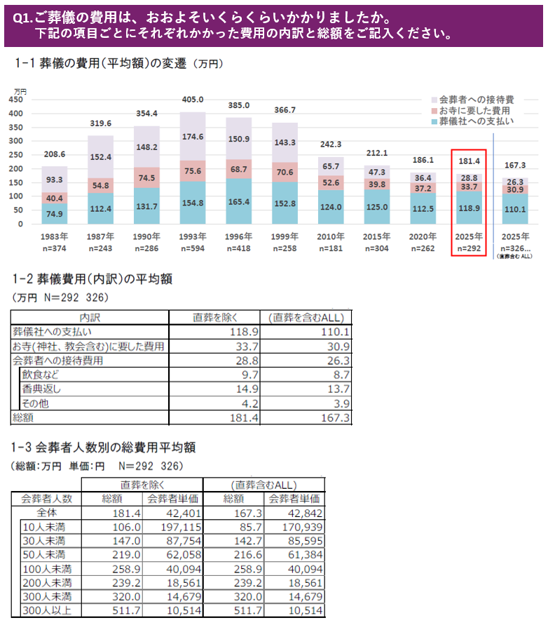 (1)葬儀の費用総額は平均181.4万円と、100万円台になった前回よりさらに減少。