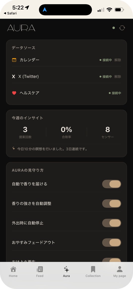 AURAは、あなたの生活に寄り添うAIエージェント。 歩数、スケジュール、心拍数、天気 。あらゆるデータを静かに読み取り、 今のあなたに最適な香りを自動で届けます。