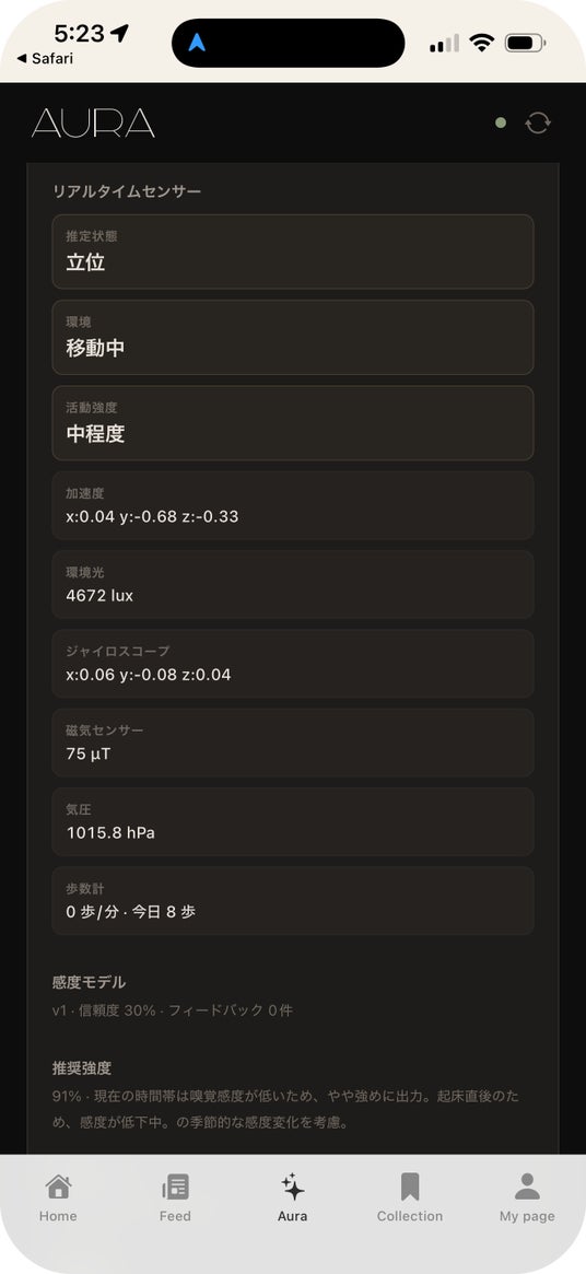 AURAは、ユーザーの健康データ・カレンダー・環境センサーをリアルタイムで解析し、その人に最も適した香りを自律的に判断・噴霧するAIエージェントです。Horizonは「香りのデジタル化」という未踏の領域で、世界に先駆けてAIエージェントを実装いたします。