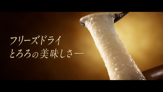 CMは、「フリーズドライ国産長芋とろろ」の便利さから、出番が減ったおろし金の哀愁ただようシーンから始まり、根菜界に激震(……!?)が走るシーンへとつながります。水を注ぐだけで、おろしたての風味と粘りがよみがえるという商品特徴を、フリーズドライブロックが復元する様子にクローズアップして表現しています。まるで壮大な映画の予告のように、フリーズドライのとろろの美味しさをドラマチックに伝えるCMとなっています。