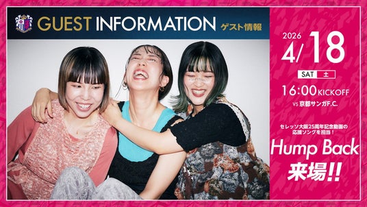 4/18(土)京都戦で、大阪出身の3ピースロックバンドHump Backの来場が決定いたしました。Hump Backのみなさんには、セレッソ大阪25周年記念動画の応援ソング「生きて行く」を担当いただきました。YANMAR HANASAKA STADIUMのこけら落としとなる一戦をさらに盛り上げていただきます。
