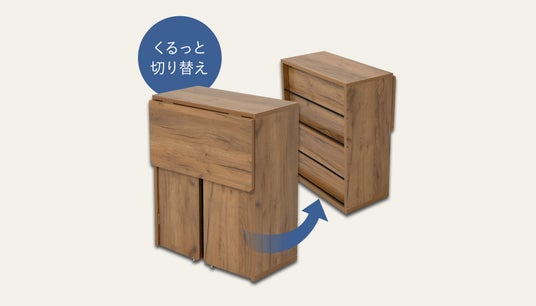 くるっと回して、天板を立てるだけ。利便性の高いラックから作業デスクに瞬時に切り替え。