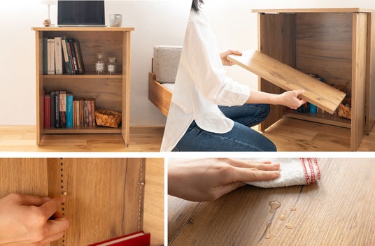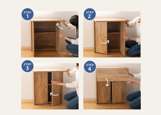 デスクの開閉は工具不要のシンプル設計。さらに本体下部には外から見えない隠しキャスターを採用し、インテリア性を損なうことなく、スムーズな移動を叶えます。