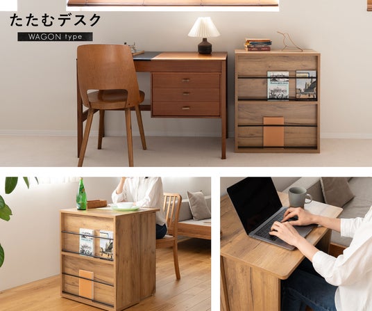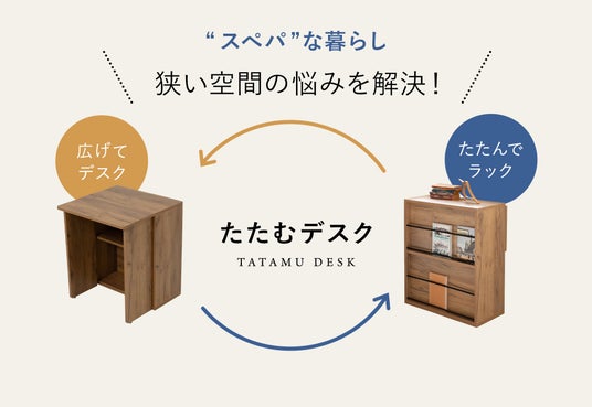 収納もデスクもこれ一台で。広げればデスク、たためば収納ワゴンになるスぺパ家具『たたむデスク ワゴンタイプ』新登場!狭小物件はもちろんリビングや寝室でも使いやすい2WAY家具です。