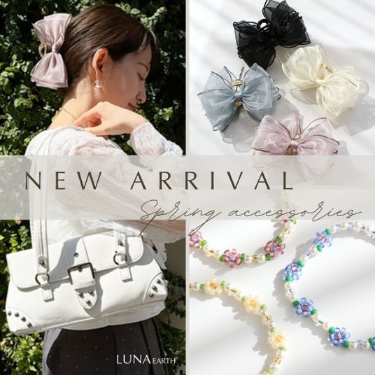 LUNA EARTH ONLINEより、ふんわり感が人気のシュシュ&リボンバンス、さらにバッグアイテムや春感満載のアクセサリーなどが4/2(木)新入荷しました。