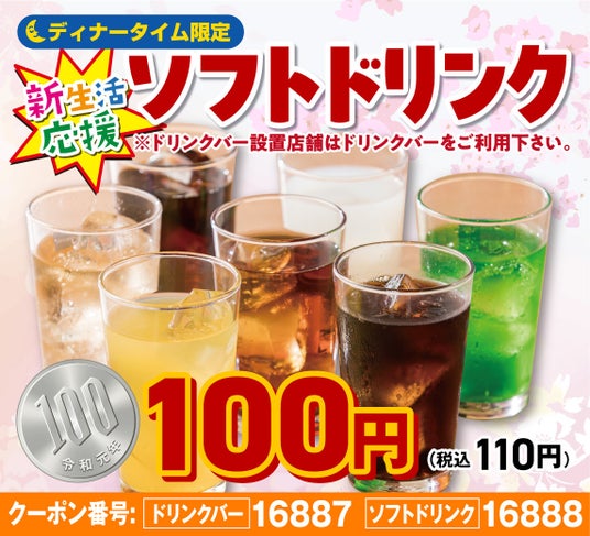 ドリンクバーを設置していない店舗は【ソフトドリンク】のクーポンをご利用ください。