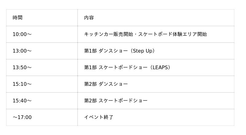 スケートボードショーには、YouTubeフォロワー約18万人・「日本一のオーリーを持つ男」として知られる中澤克哉氏率いるスケートボードチーム「LEAPS」が出演。ダンスショーには、関西最大級のキッズストリートダンス教室「Step Up」(代表:堀井清三氏)が出演し、10チーム以上の子どもたちによる圧巻のパフォーマンスをお届けします。また、3店舗のキッチンカーも出店し、イベントを盛り上げます。