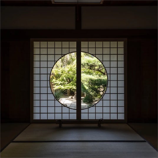 窓、壁、障子に月のモチーフを抱き、波心の庭から眺めることで東の空に昇る月を愉しむ仕掛けになっている。