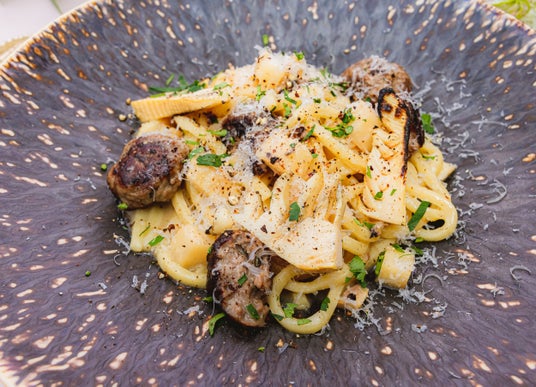 薪で焼いた筍の歯ごたえと、ハーブ香る自家製サルシッチャ。太麺のトンナレッリに濃厚なチーズと胡椒が絡む、食べ応えのある一品。