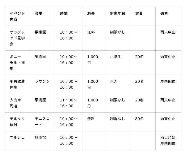 ※サラブレッドやポニーの体調により、時間、内容が変更になる場合がございます