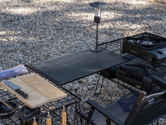 ・別売の「アウトドアラック用天板」を装着し、テーブルやラックとしてのスペースを確保。