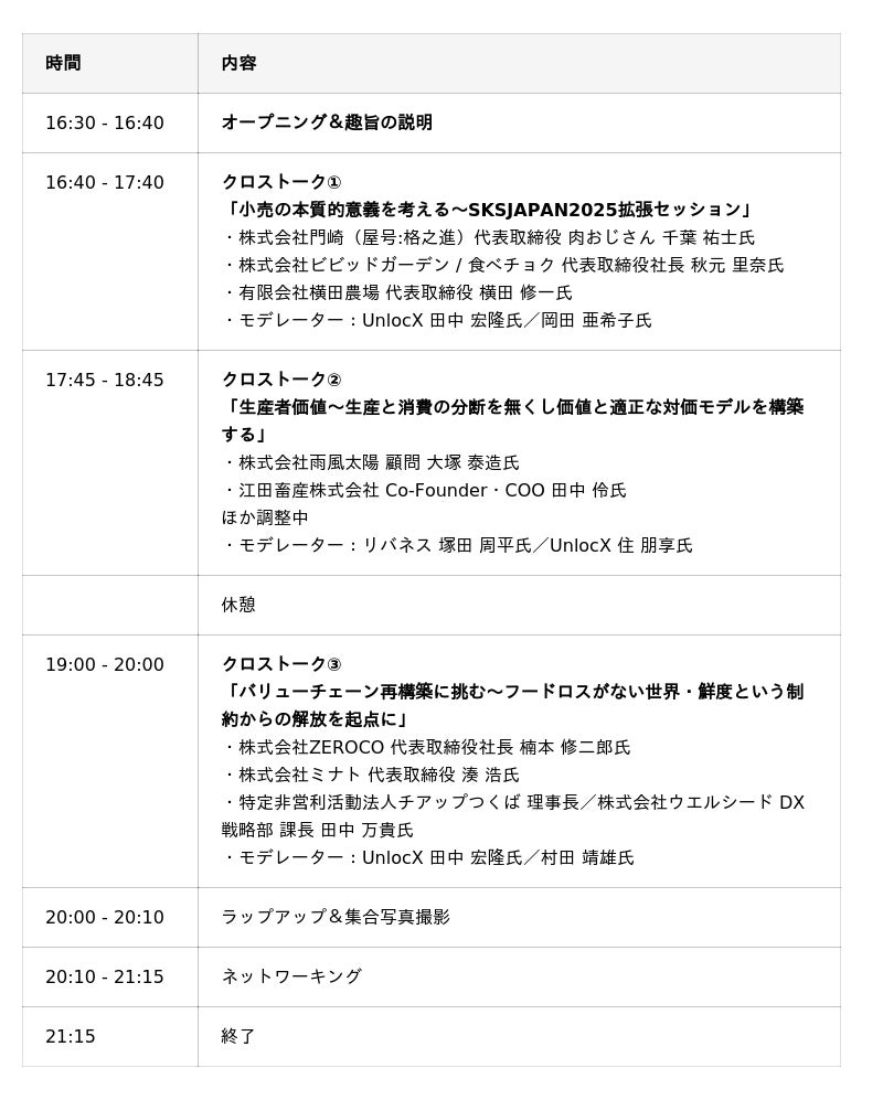 本イベントでは、生産・加工・流通・外食といった「食のバリューチェーン」全体を俯瞰し、その再構築に向けた具体的アクションを議論します。領域の垣根を越え、食のバリューチェーンのシステムチェンジに挑むチェンジメーカーをパネリストに迎え、「小売の本質的意義」「生産者の価値」「フードロス・鮮度からの解放」という3つの観点から各社の取り組みを紹介。現場で見えているにもかかわらず十分に可視化されていない課題や、現場で生まれつつある実践知・問いを持ち寄ります。