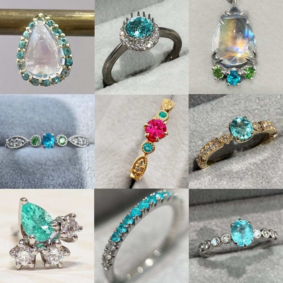 なかでも中心となるのは、モザンビーク産のパライバトルマリンです。銅を含むことで生まれる鮮やかなネオンブルーからグリーンを帯びた発色と、高い透明感が特徴で、今回のパーセル ジュエリーなんば店では大粒を含むルースをご用意いたしました。ハートシェイプをはじめ、形や大きさの異なる石が揃い、面積によって変わる光の印象まで見比べていただけます。