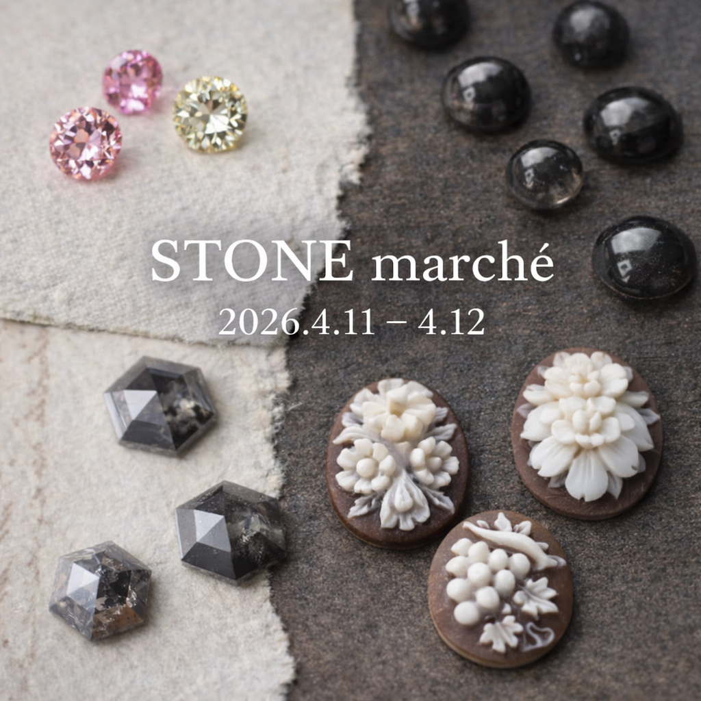 毎月開催している「STONE marche(ストーンマルシェ)」は、多彩な宝石を一堂にご覧いただける催しです。お仕立てのご相談はもちろん、ルースのままのお迎えも承っております。会期中のルースは、すべて通常の約半額にてご紹介いたします。