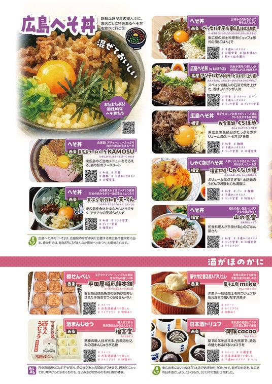 ・東広島市の多彩なご当地グルメや、特産品を使ったメニューを80点以上掲載・冊子内の随所に「ヒガシル」へのQRコードを掲載し、紙とウェブを連携