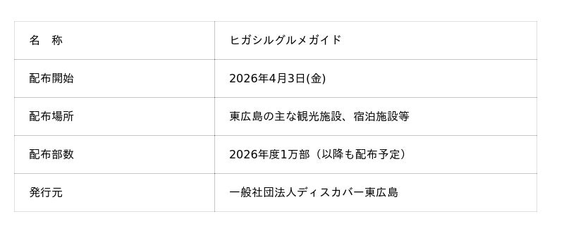 一般社団法人ディスカバー東広島は、2026年4月3日(金)より、「ヒガシルグルメガイド」の配布を開始しました。