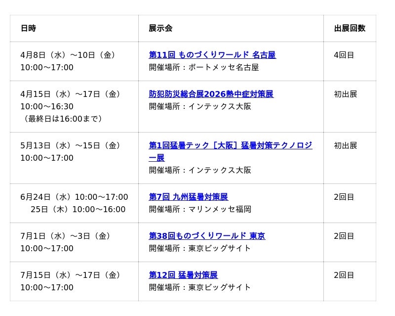 2025年発売以降、現場から高い評価をいただいていることを受け、製造業や建設業など労働現場での熱中症対策の提案を強化し、昨年から出展数を増やし、4~7月の間に6つの展示会に出展します。