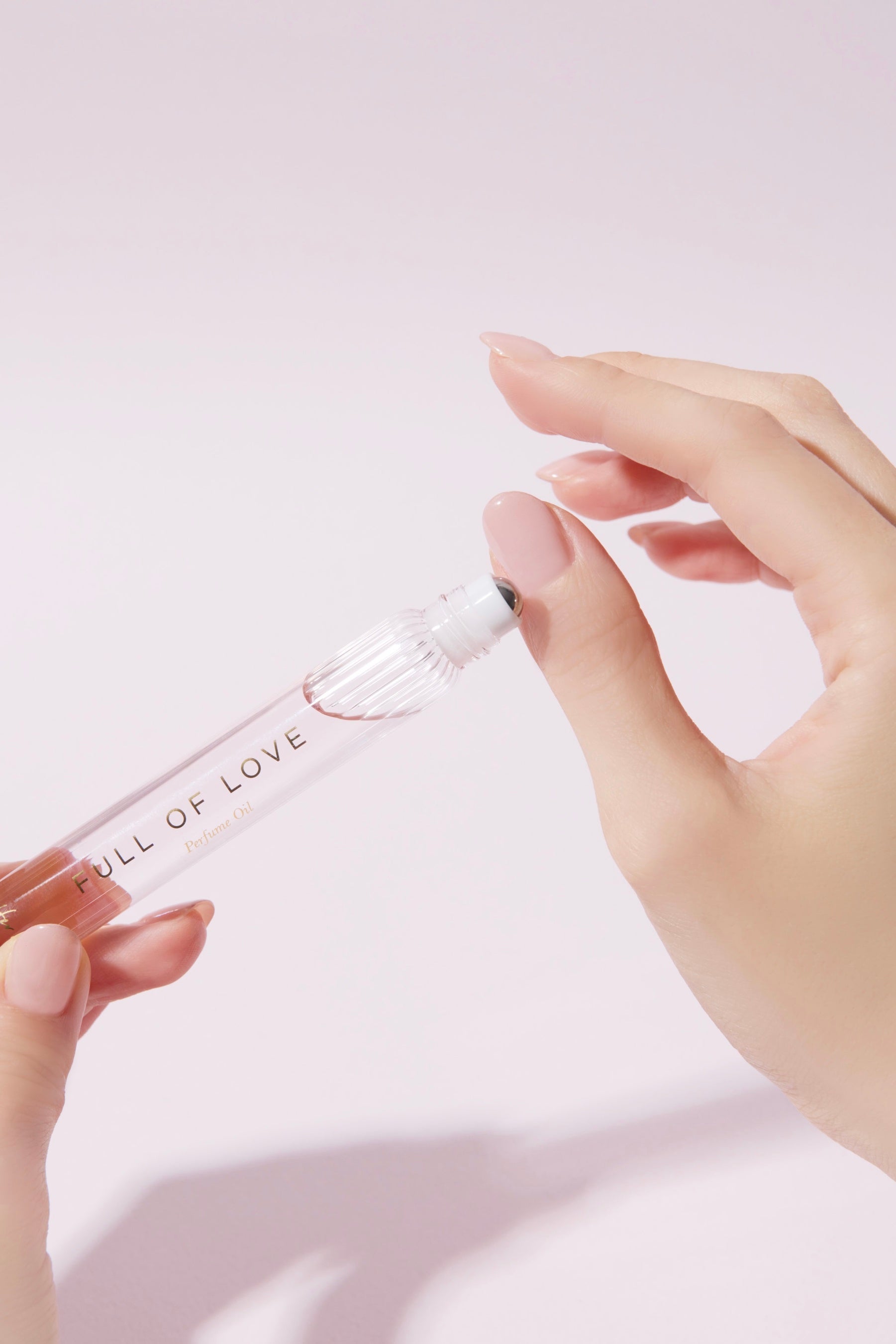 FULL OF LOVEの多幸感溢れる香りからインスピレーションを受けた淡いピンクと、宝石のような煌めくボトルで、パッケージを開けた瞬間から胸が踊るデザインに仕上げました。スリムで軽量なロールオンタイプのため、外出先でもさりげなくエレガントに香りを纏うことができます。