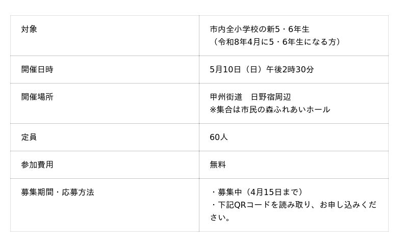 第29回ひの新選組まつりのメインイベントの一つ「隊士パレード」にご参加いただき、ひの新選組まつりを盛り上げていただける市内小・中学生を募集しています。皆さまの応募をお待ちしています。