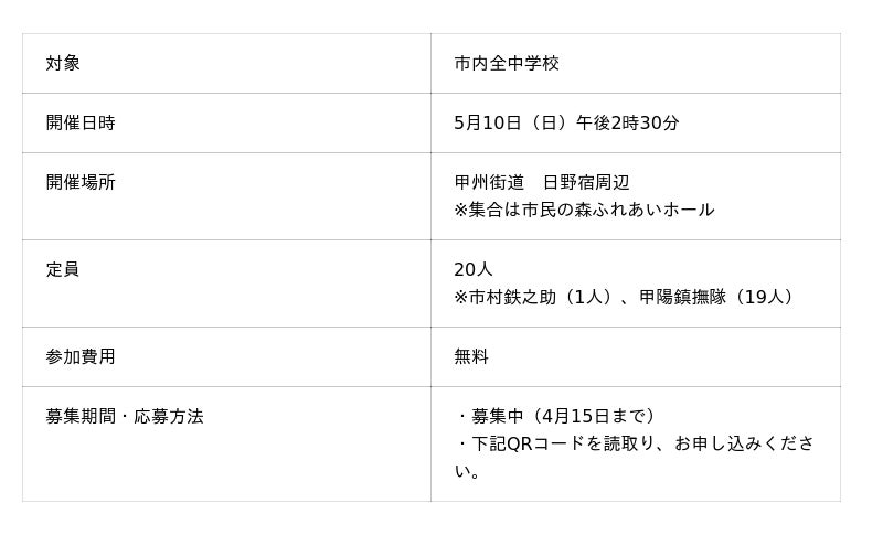 春日隊の時代衣装を着て、隊士パレードで歩いていただく方を市内小学生から募集します。