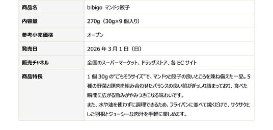 当社は、「bibigo マンドゥ餃子」の好調な立ち上がりを追い風に、今後さらなる配荷拡大と販促施策の強化を推進してまいります。冷凍餃子売場における「マンドゥ」という新たなカテゴリーの定着を図るとともに、より多くの生活者にbibigoならではの新しい食体験をお届けしてまいります。店頭・EC・各種プロモーションを通じてブランド接点をさらに拡大し、日本の食卓に新たな楽しみと定番を創出することで、Kフード市場のさらなる成長に貢献してまいります。
