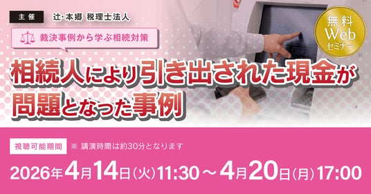 辻・本郷 税理士法人(本社:東京都新宿区、理事長:桑木小恵子)は、2026年4月14日(火)より「【裁決事例から学ぶ相続対策】相続人により引き出された現金が問題となった事例」セミナーを開催いたします。